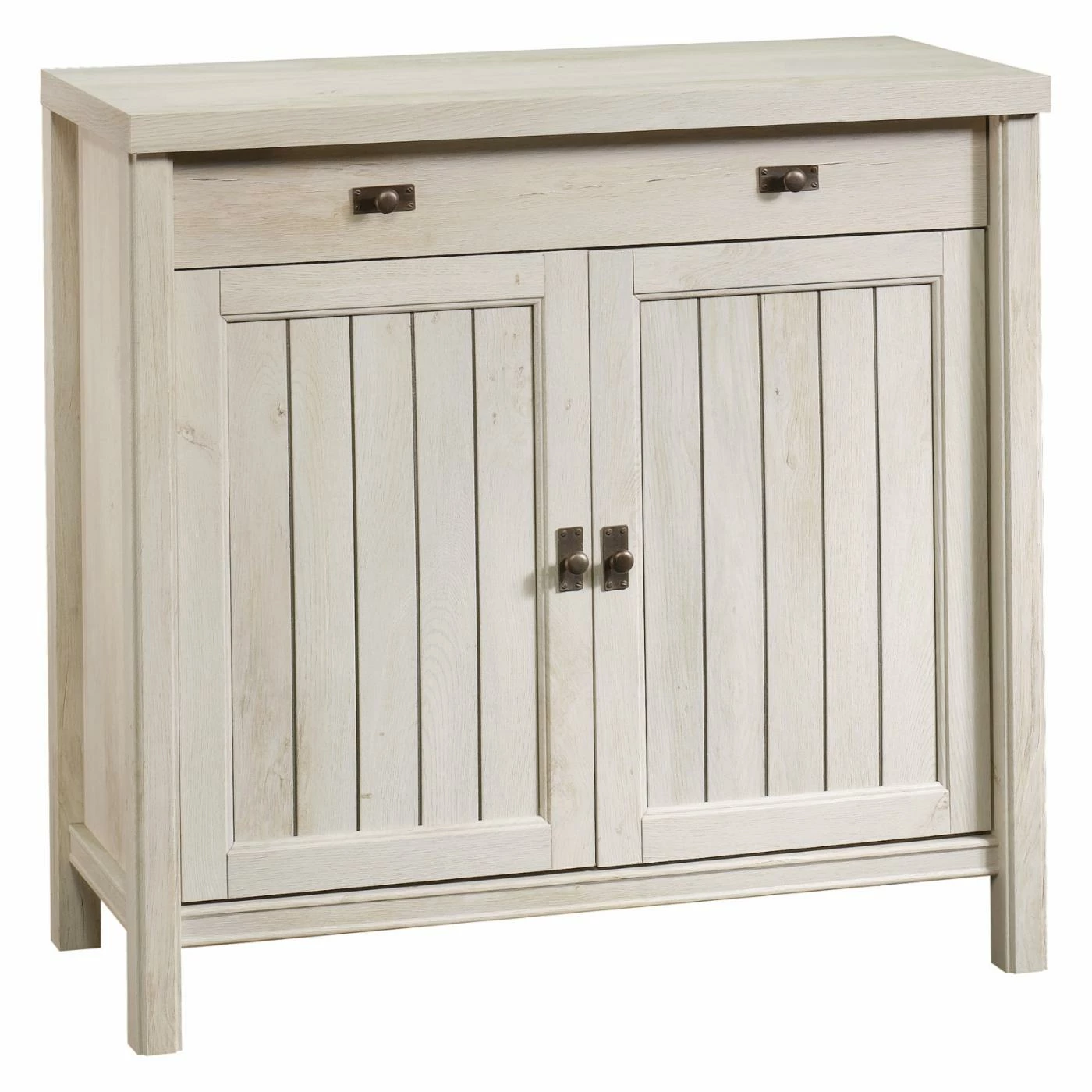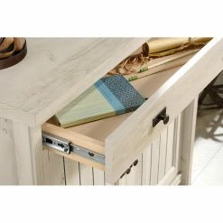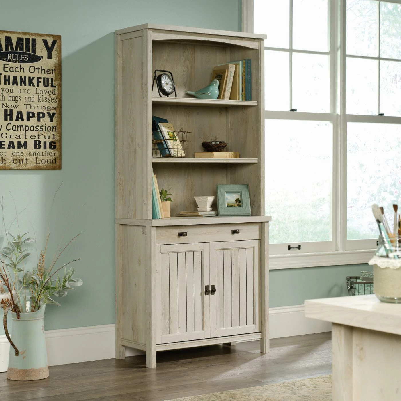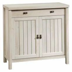 Featuring elegant coastal style, the Costa Library Cabinet with Optional Hutch is the perfect addition to your home office or work space. This set-up is made with durable engineered wood and features slat-front detailing and paneling with a chalked chestnut finish. The optional hutch includes three shelves, two of which are adjustable. The cabinet has a large adjustable shelf behind two doors. A large drawer is also included in the cabinet. Choose from available configurations.