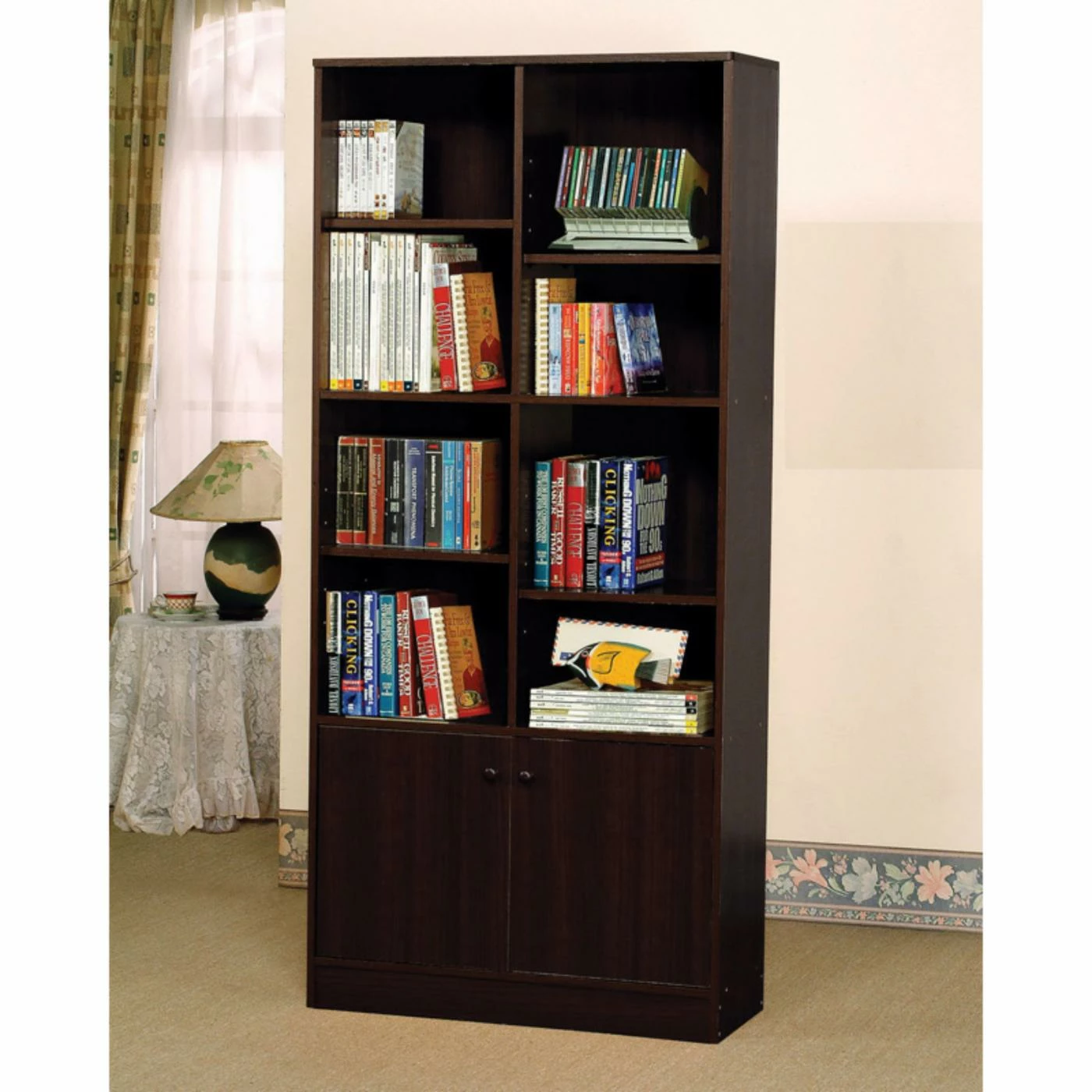 The Acme Furniture Verden Bookcase brings sleek style and function to any room in your home. The solid wood structure boasts eight open compartments for plentiful storage. Four fixed shelves and four adjustable shelves allow you to customize the storage space for anything from books to decorative items. Two cabinets at the bottom of this espresso bookcase offer enclosed storage space with simple round pulls.