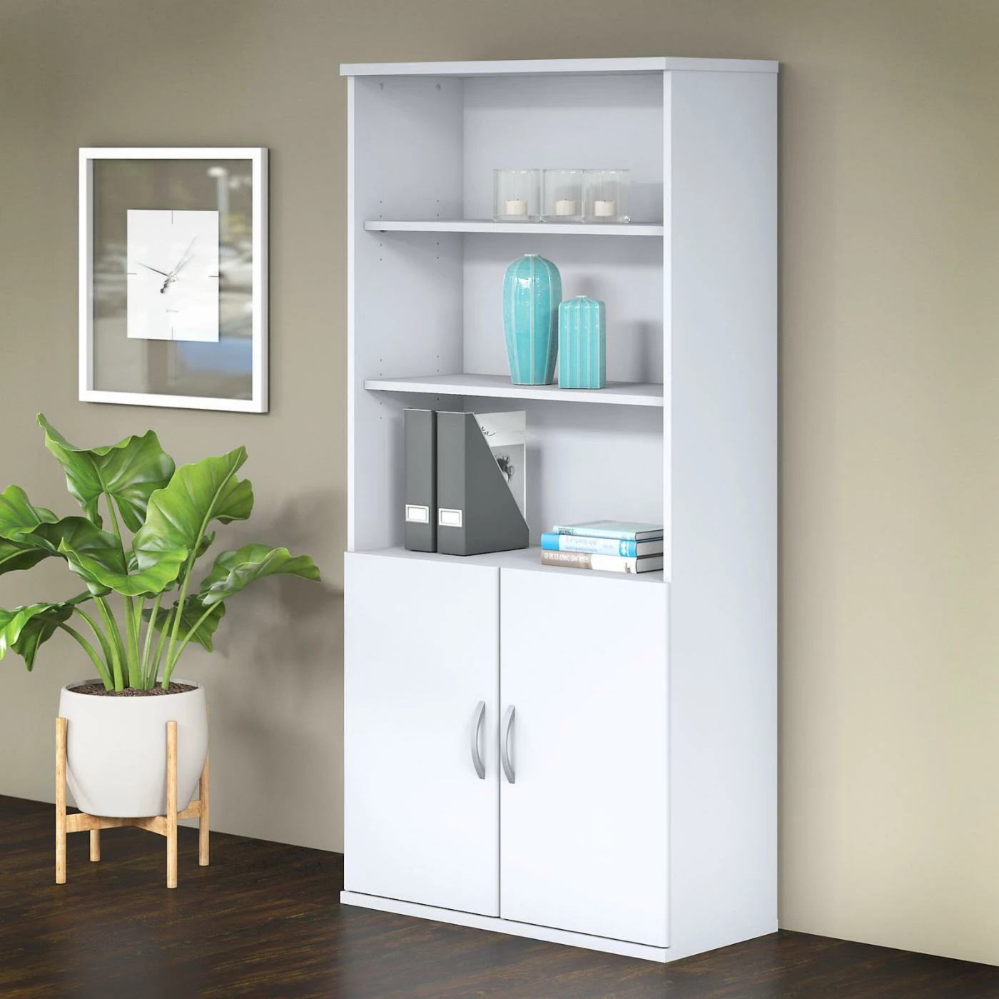 Whether youβre looking for a bookcase for your office or home, the Bush Business Furniture Studio C 5-Shelf Bookcase with Doors is a modern and elegant piece that works in any setting. Featuring three adjustable and two fixed shelves, youβll have ample space for books, binders, notebooks, decorative items, and more. The bottom two drawers are enclosed behind two doors, making them perfect for holding those messier items. With each shelf able to hold up to 50 lbs., youβll have no trouble storing everything you need. Crafted from thermally fused laminate over engineered wood, and with your choice of available finishes, this stain- and scratch-resistant bookcase will look great for years.