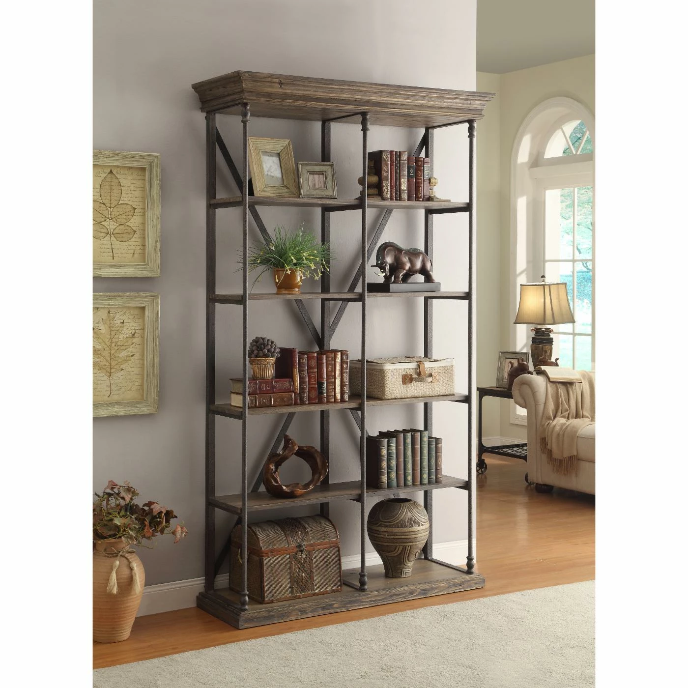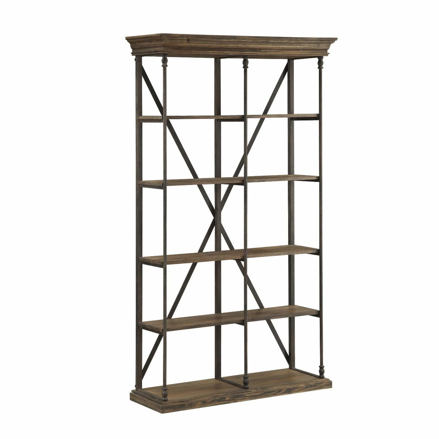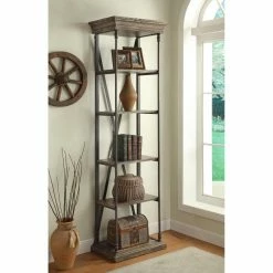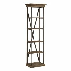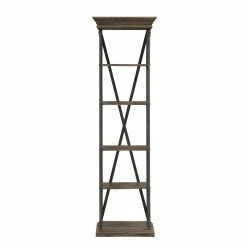 The industrial style Coast to Coast Industrial X-Back Bookcase offers a striking blend of the bold and rustic. Its reclaimed pinewood slabs flaunt a rustic charm while the iron X-frame adds a more modern element to your display. Four shelves give you more than enough room for showing off books, movies, and various decor, and the top and base feature a beveled edge for a dramatic finishing touch. And, speaking of finish, the wood accents come in a wonderfully warm and neutral Hylas Medium Brown coat. Some assembly is required.