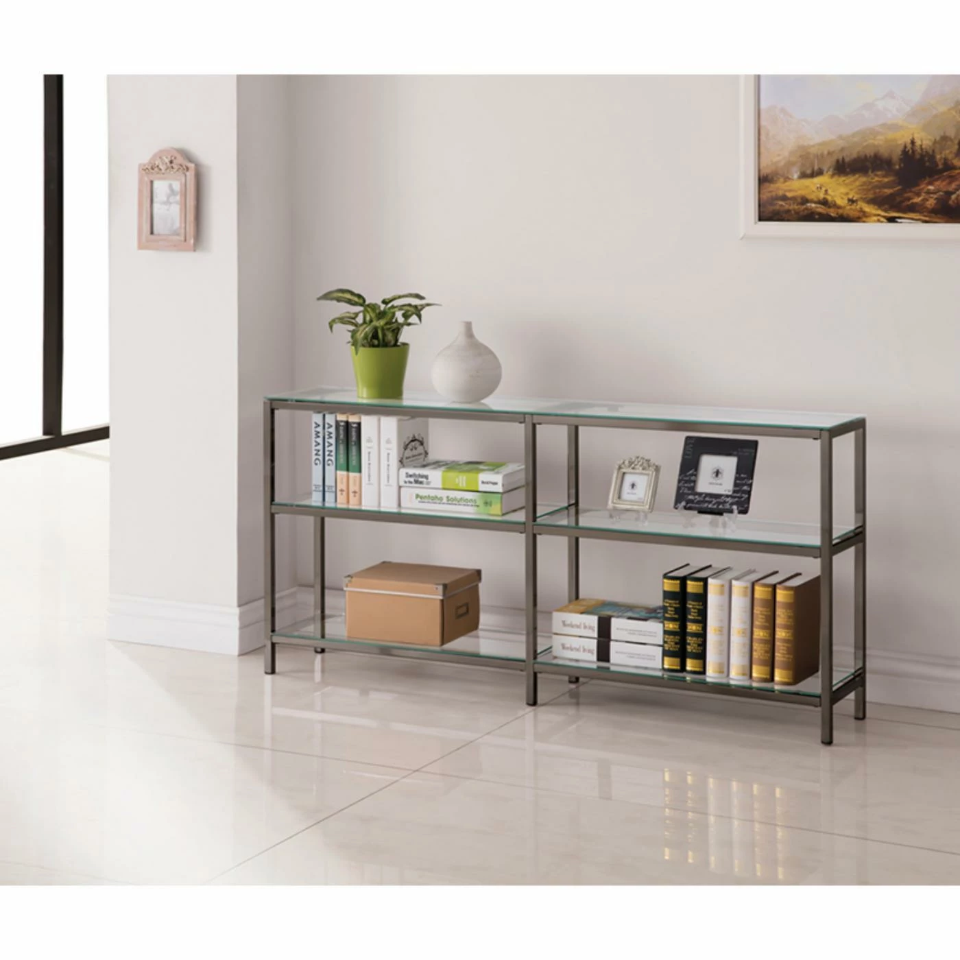 The Coaster Furniture Modern Glass Top Lateral Bookcase is a stunning way to show off your books and collectibles with an elongated, lateral placement. This modern bookcase is enhanced with a durable metal frame finished in a metallic black nickel hue. The glass shelves add an eye-popping look, and the open-back design creates a contemporary feel to your favorite space.
