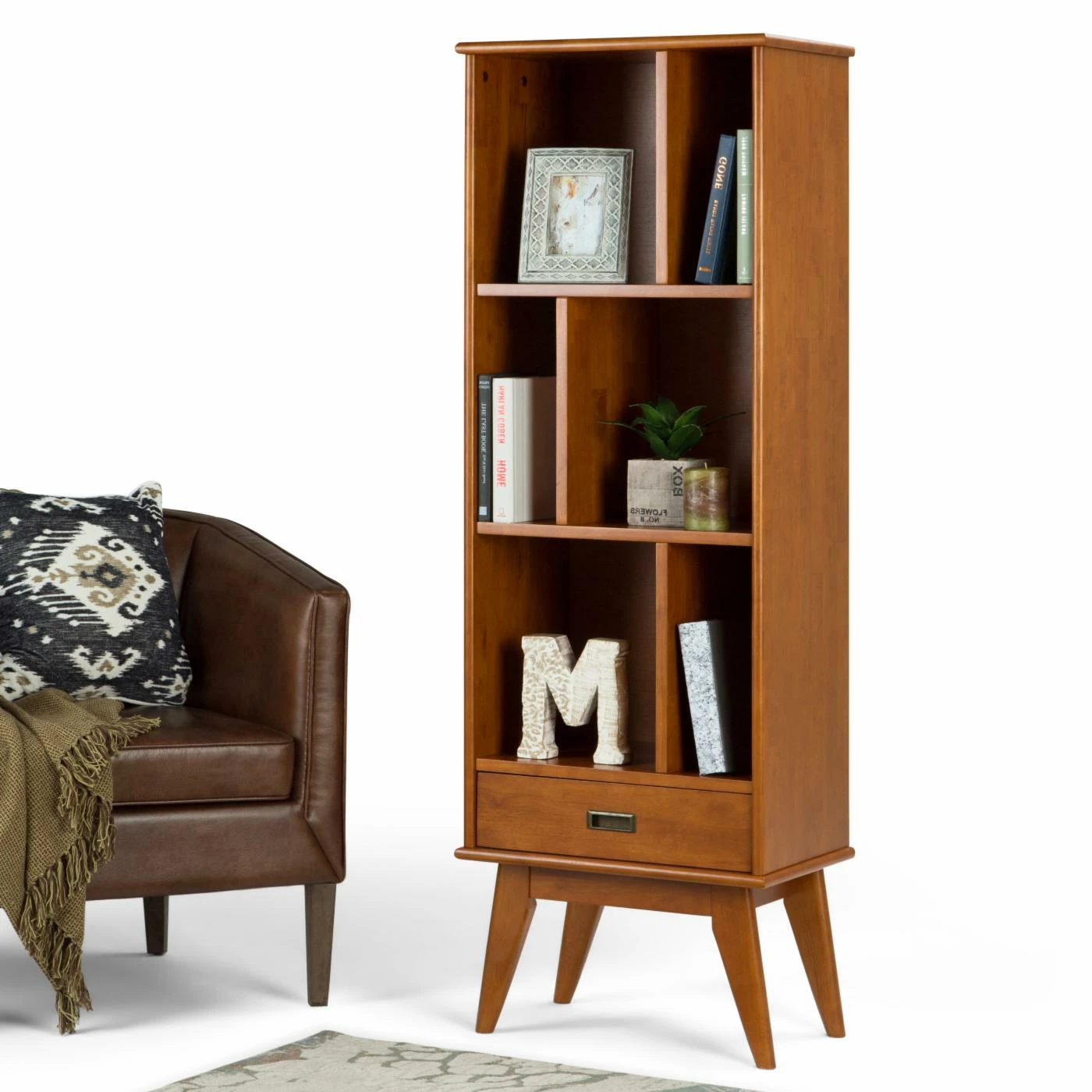 Display your favorite books, keepsakes, and other essentials with the HN Home Hughes Mid-Century Modern Mid-Century Bookcase. This handsome mid-century modern piece is hand-crafted with care using the finest-quality rubberwood, then finished with a rich hue that highlights the variegated tones and thick grains in the wood. You’ll get six spacious, multi-sized shelves and one soft-close drawer for further organizational utility. Its tapered legs round out the clean-lined, contemporary aesthetic, lending a warm energy to your living room, home office, or any other interior space.