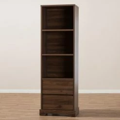The HN Home Tacoma Transitional Walnut Brown Finished Wood 2 Drawer Bookcase gives you the perfect balance of simplicity and charm. This sturdy wooden bookcase is made from wood and engineered wood in a warm walnut brown finish. The streamlined design is modern, with no hardware or clutter. Three open shelves and two drawers give you plenty of display and storage space.