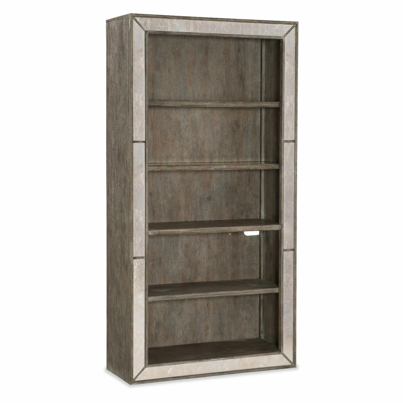 To make the Hooker Furniture Rustic Glam Bookcase as practical as it is chic, it includes a touch-light at the top to showcase whatever you choose to display. Smart shelving includes two wood framed glass shelves, one adjustable wood shelf, and one fixed wood shelf. This bookcase is built of rubberwood solids and quartered white oak veneer in a multi-step gray finish that includes antiquing, wire brushing, gouging, and rasping. Eglomise glass panels add vintage glam appeal to this bookcase.