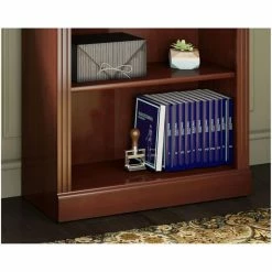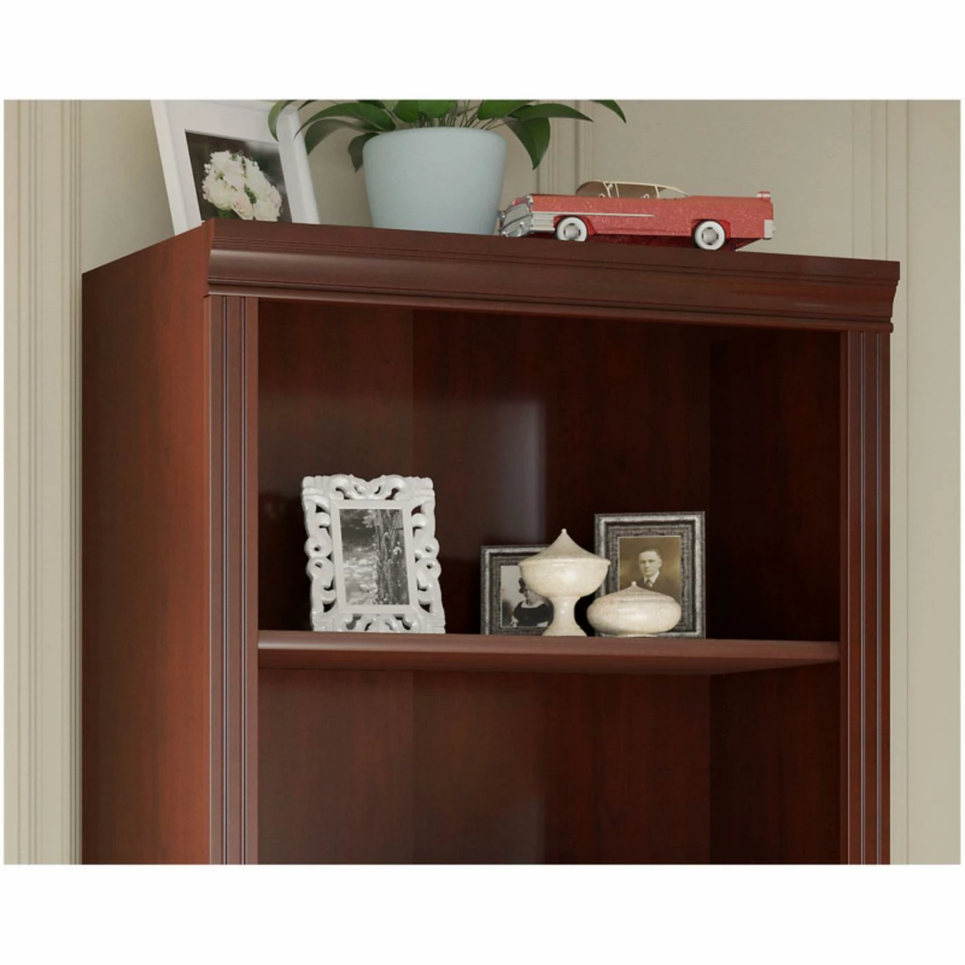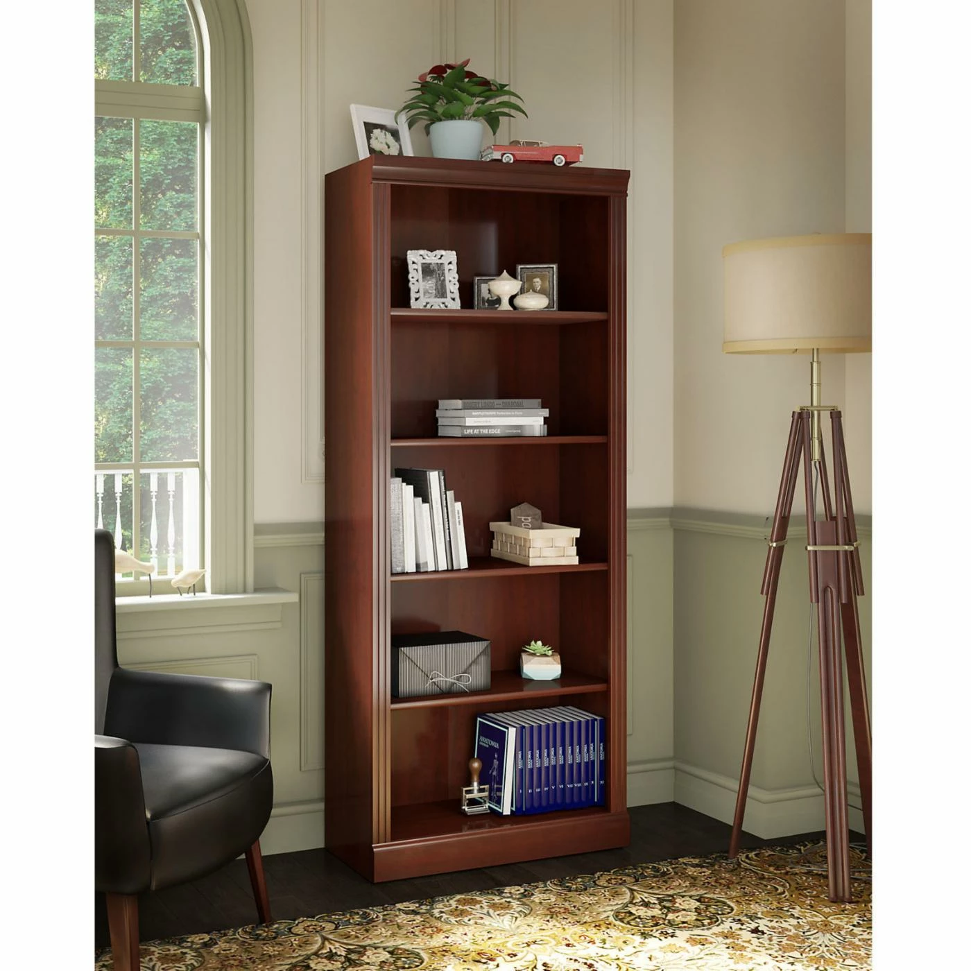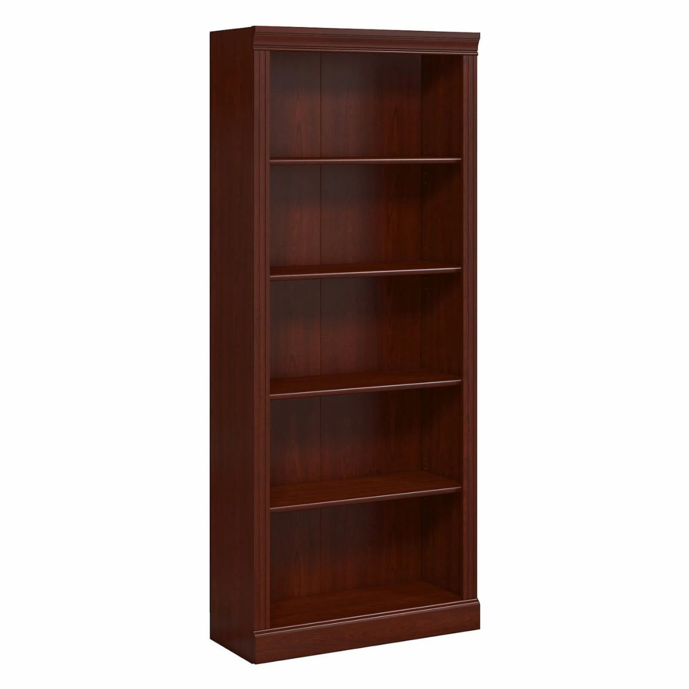 For classic furniture built to last, choose the kathy irelandยฎ Office by kathy ireland Home by Bush Furniture Business Furniture Bennington 5 Shelf Bookcase – Harvest Cherry. This timeless slender design fits where you need it most, or add multiples side by side for a complete storage wall design. This bookcase includes three adjustable shelves and two fixed shelves and features decorative edge detailing which adds to its refined elegance and charm. The rich Harvest Cherry finish complements virtually any room or dรฉcor. Durably constructed, this product meets ANSI BIFMA furniture standards for safety and performance. Bring a sense of timeless style and tradition into your home or workspace with this and other products from the Bennington Collection. See the full line for other items available all backed by a six-year manufacturer’s warranty.