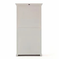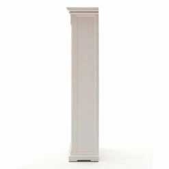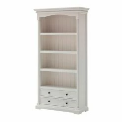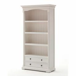 The Nova Solo Provence Bookcase effortlessly stores and displays books, decor, picture frames, and more. This piece is made of solid mahogany with a semi-gloss, hand painted white finish. It features detailed moulding with a classic aesthetic. Two large drawers at the base with antique brass pulls and four shelves provide ample storage. No assembly is required for this bookcase.