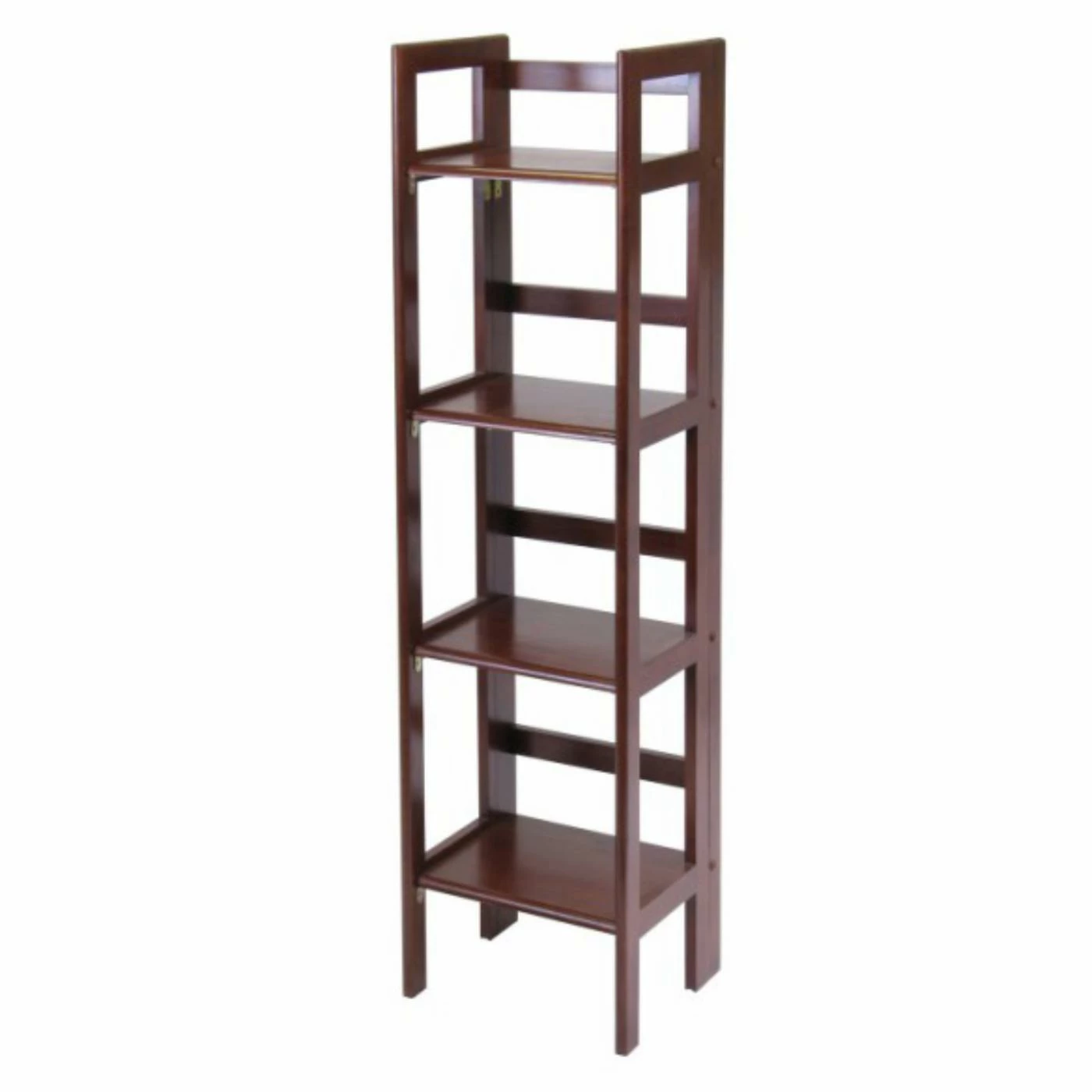 Our 4 Shelf Folding Bookcase – Walnut will spare your home’s corners of the dreaded pile, whether made of clothes, linens and towels, or toys. Unfold the shelf in one quick motion for instant, breezy storage. Use this solid rubberwood and veneer bookcase in the bathroom, bedroom, or office. Its rich antique walnut finish and clean, unfettered, design will fit into virtually any design scheme. And the narrow size – just longer than a foot – slips into corners and other small spaces without feeling crowded.