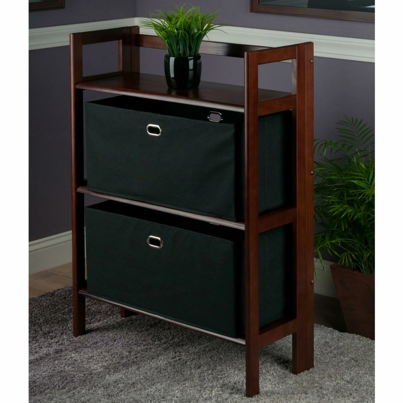 Give you space a versatile touch with the folding design of the Winsome Trading Torino Folding Bookcase with Baskets. This bookcase is designed to fold down when not in use, making it easy to transport and store. It includes two folding baskets that have a sturdy fiberboard frame with rugged fabric upholstery. Each basket has metal-rimmed carry handles, making it easy to grasp and carry.