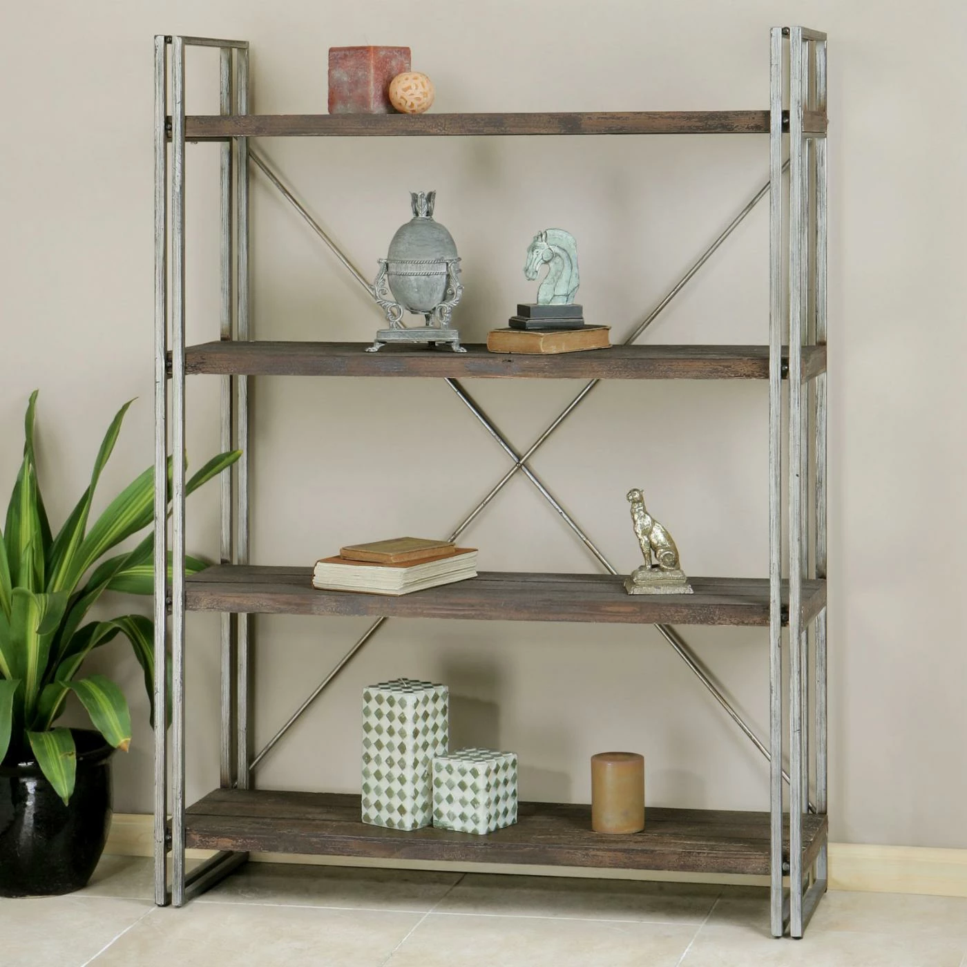 - Open-back bookcase with antiqued silver metal frame and cross back