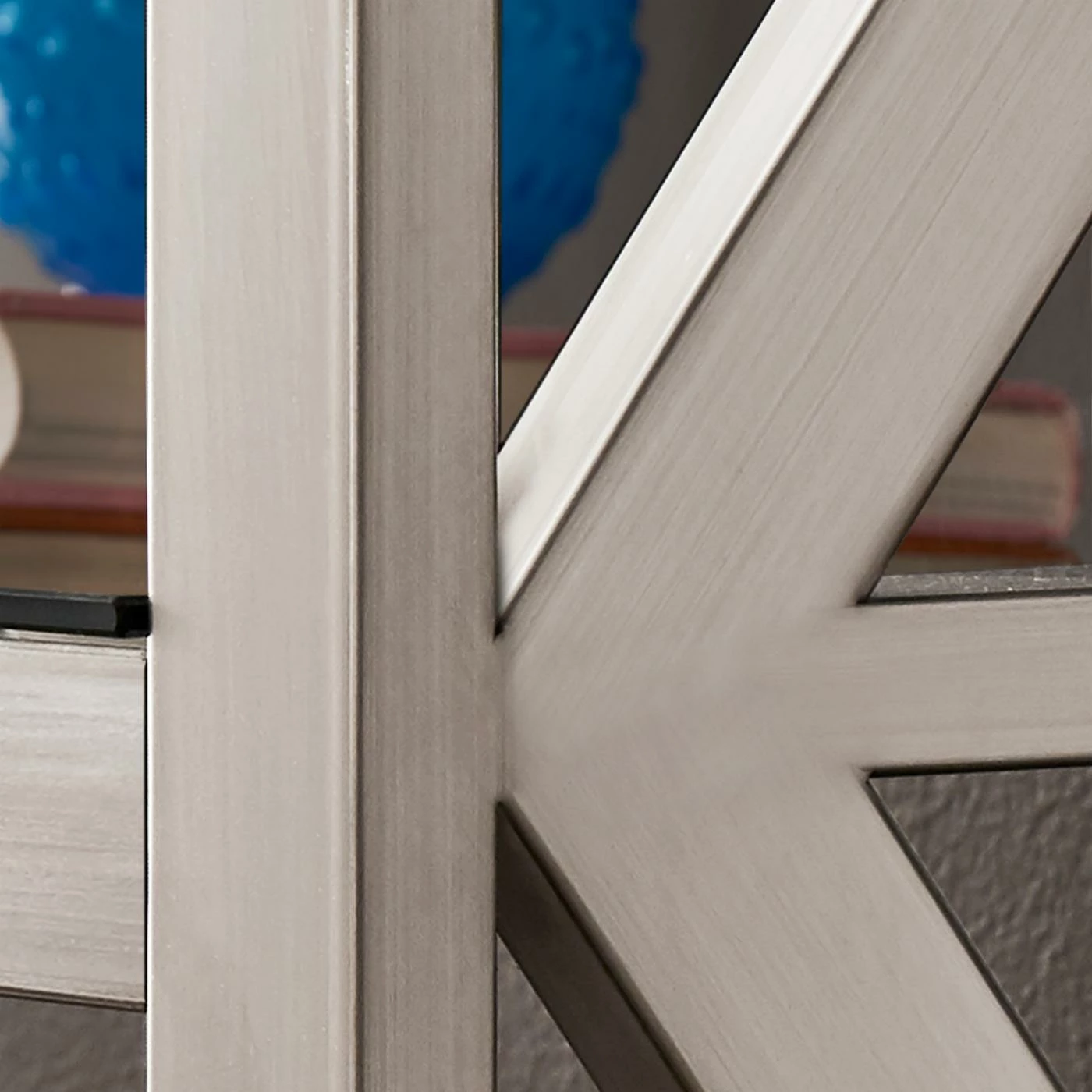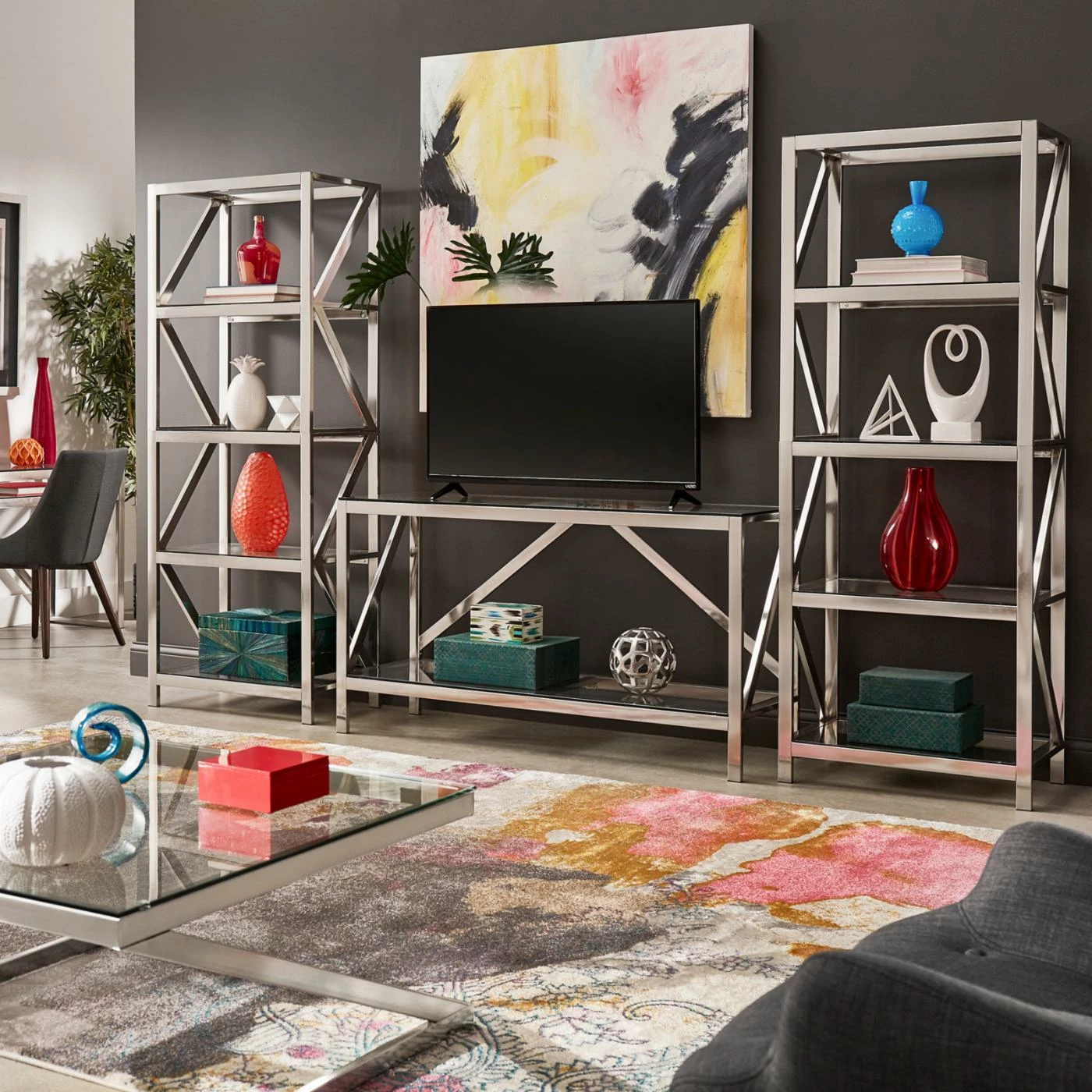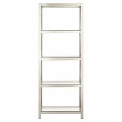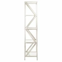 Add style and storage to your home with the Weston Home Erika Decorative Bookcase – Brushed Nickel. This bookcase features four clear glass shelves for your books and dΓ©cor items. The open metal frame is in a sleek brushed nickel finish. Angled metal bars on the sides of the bookcase create an interesting, slightly geometric design. With its mixed materials and contemporary silhouette, this bookcase is sure to add a touch of modern style to any room it’s in. Some assembly required.