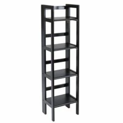 Perfect for college students on the move or for a little nook in your home, the 4 Shelf Folding Bookcase – Black will solve your storage conundrums. This folding shelf can attractively display home accessories, photos, books, or towels and folds up quickly and smoothly when it’s time to rearrange or move. Constructed of beech wood and veneers with a black painted finish, the timeless, simple shape of this practical shelf provides storage in any room in the house. Assembly required.