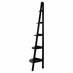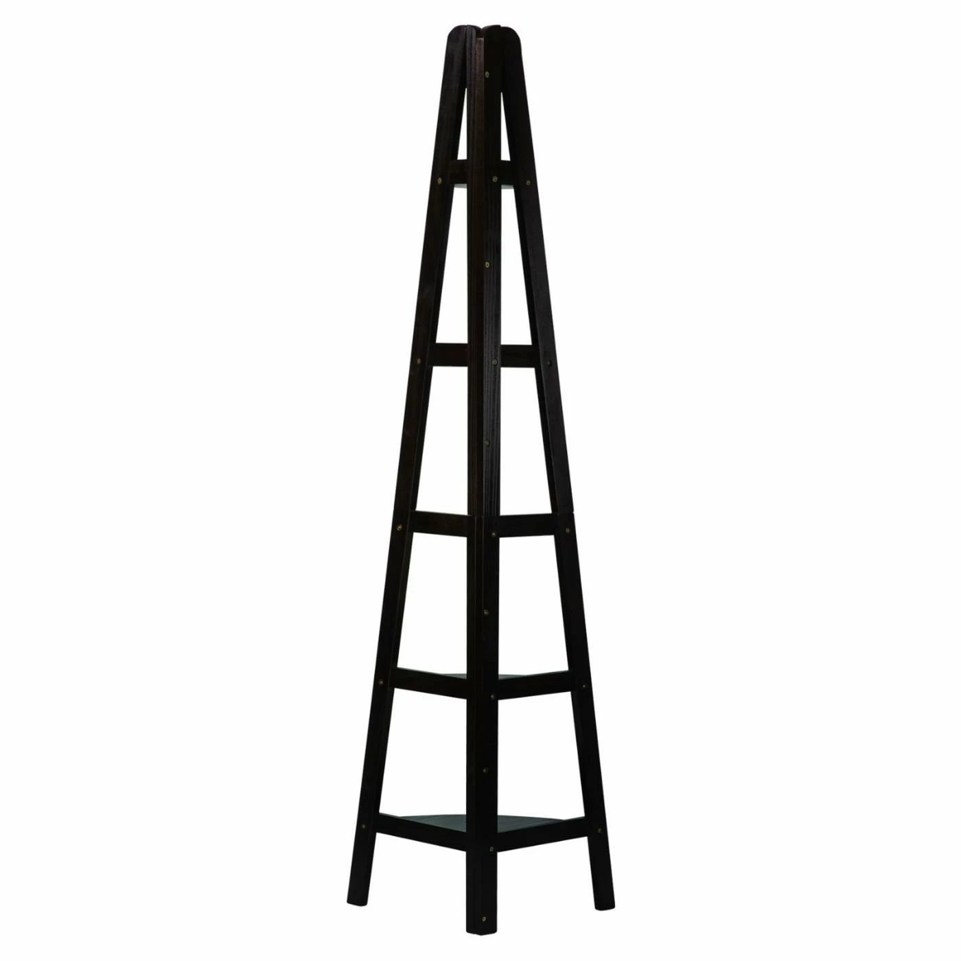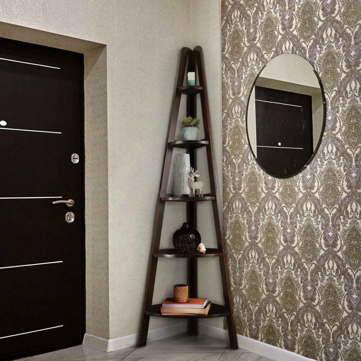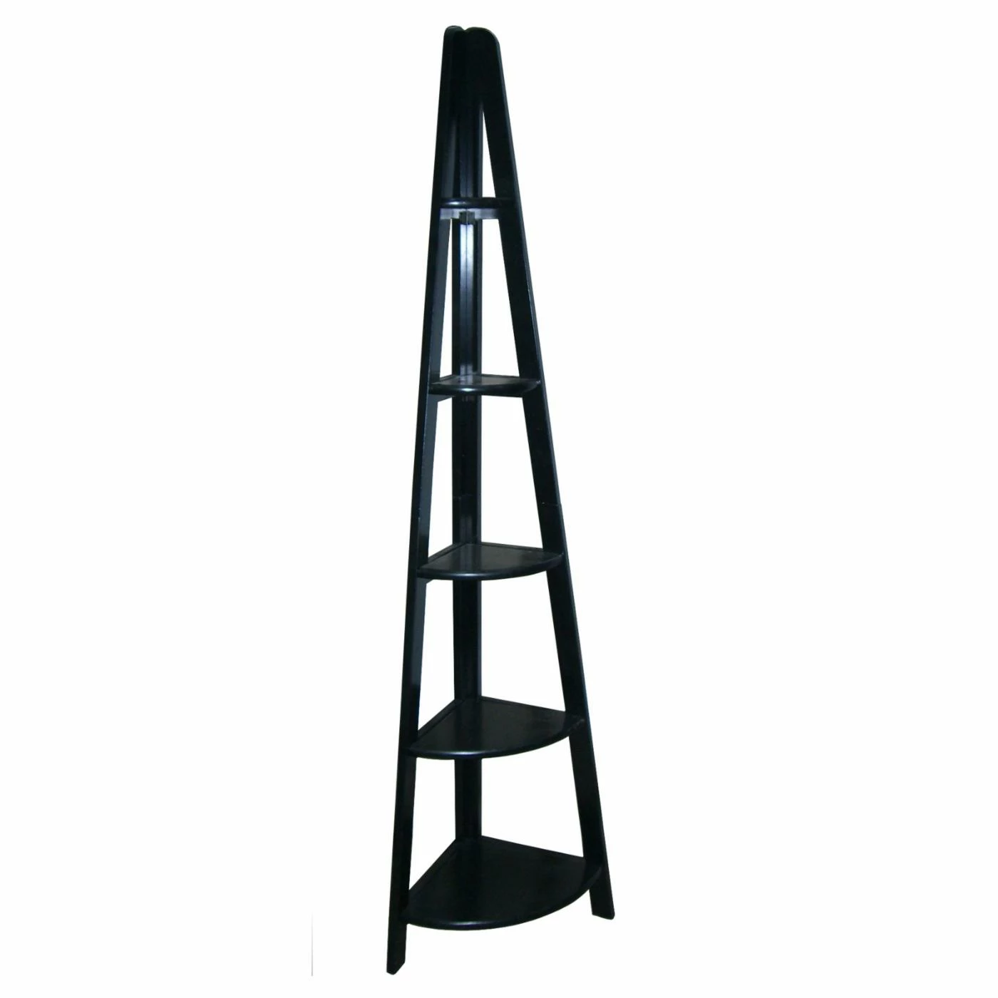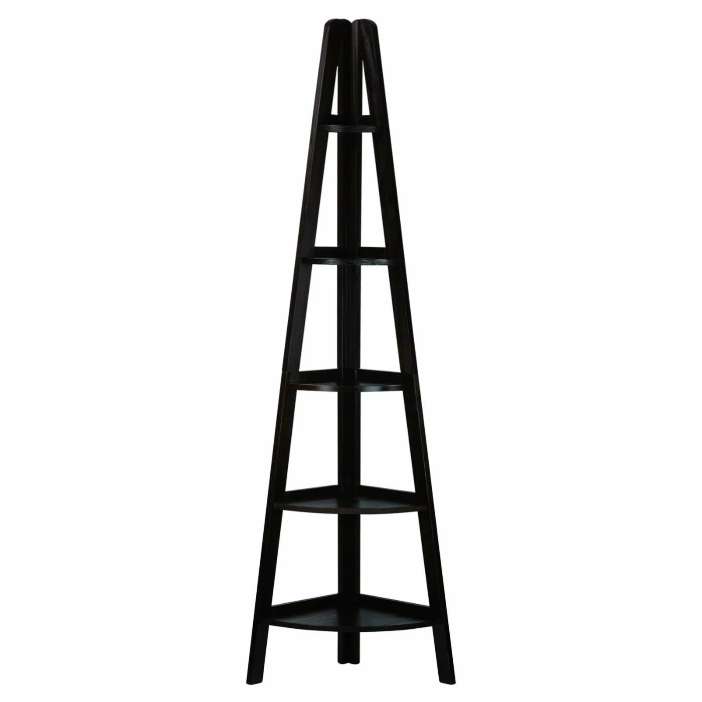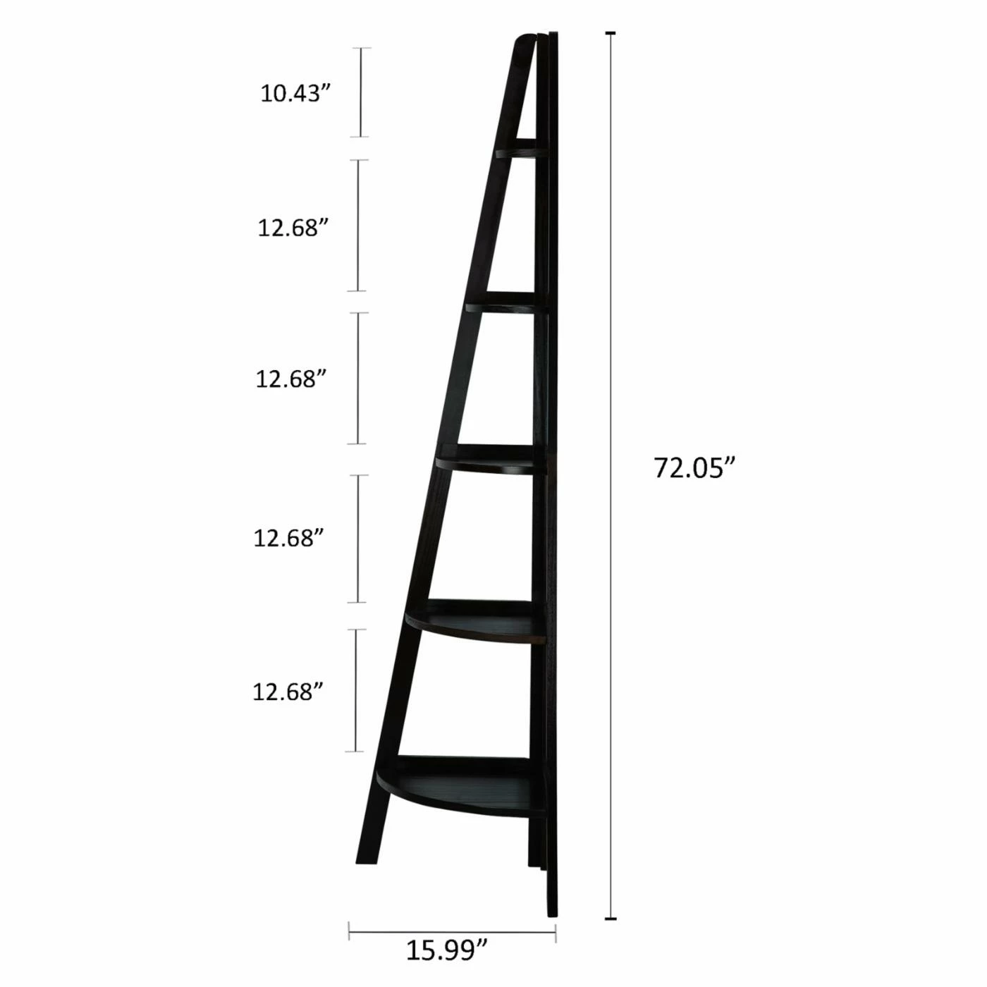 Snuggle the Five-Shelf Corner Ladder Bookcase in Espresso into any corner and show off your favorite books and art pieces. This bookcase has an open-back ladder design that lends a spacious feel and is well-built of solid wood for durability. A rich espresso brown finish matches nearly everything. Great for smaller rooms!