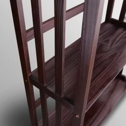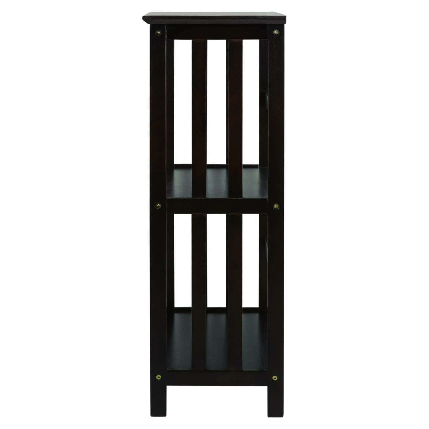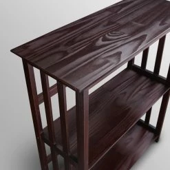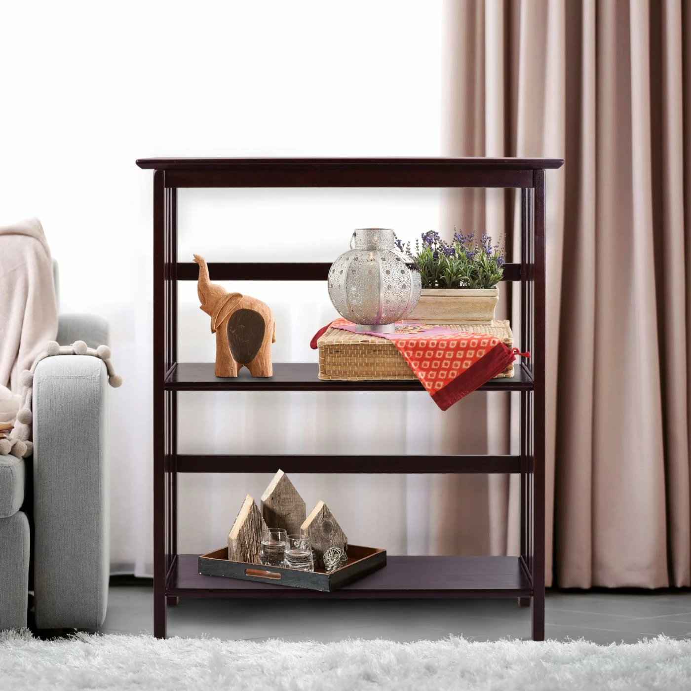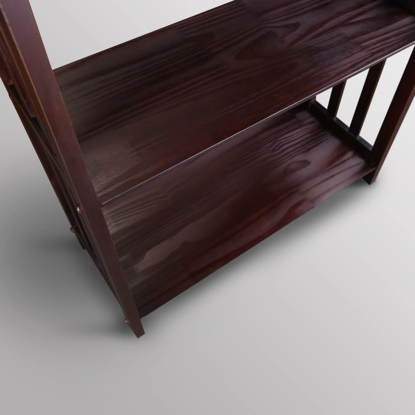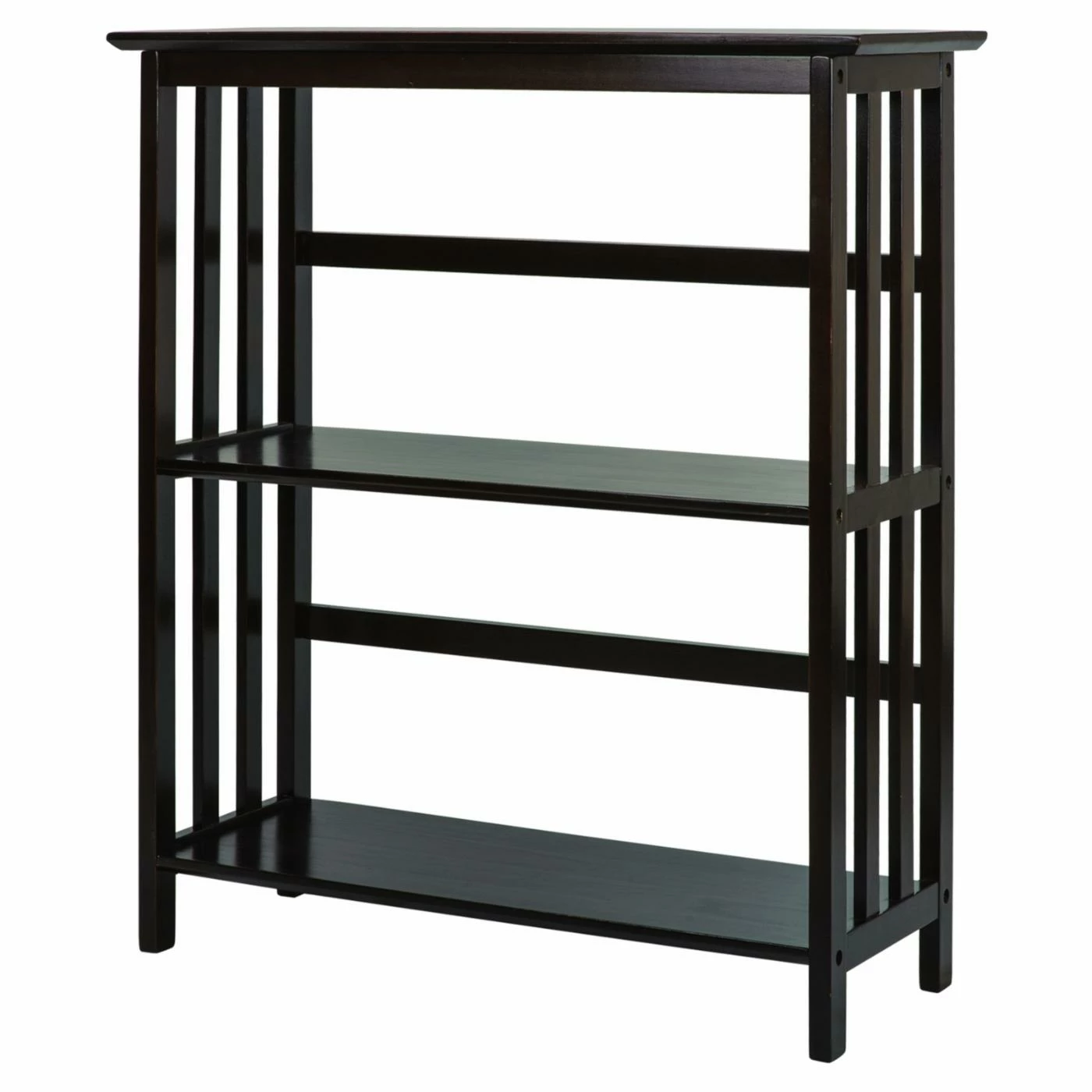 Keep your books organized and neat with this Mission 2-Shelf Bookcase. With clean, simple lines, it blends well with both traditional and contemporary rooms. This bookcase has a beautiful mission design that features slatted sides and an open back that impart an airy look and feel. Constructed of wood solids and veneers, the bookshelf has a rich espresso lacquered finish that adds opulence to any room of your home. Two shelves offer plenty of storage for books, cookbooks, DVDs, CDs, and more. This sturdy, durable bookshelf is just the addition wherever you need a bit of storage space. Assembly required. Dimensions: 29.5W x 12D x 33.5H inches.