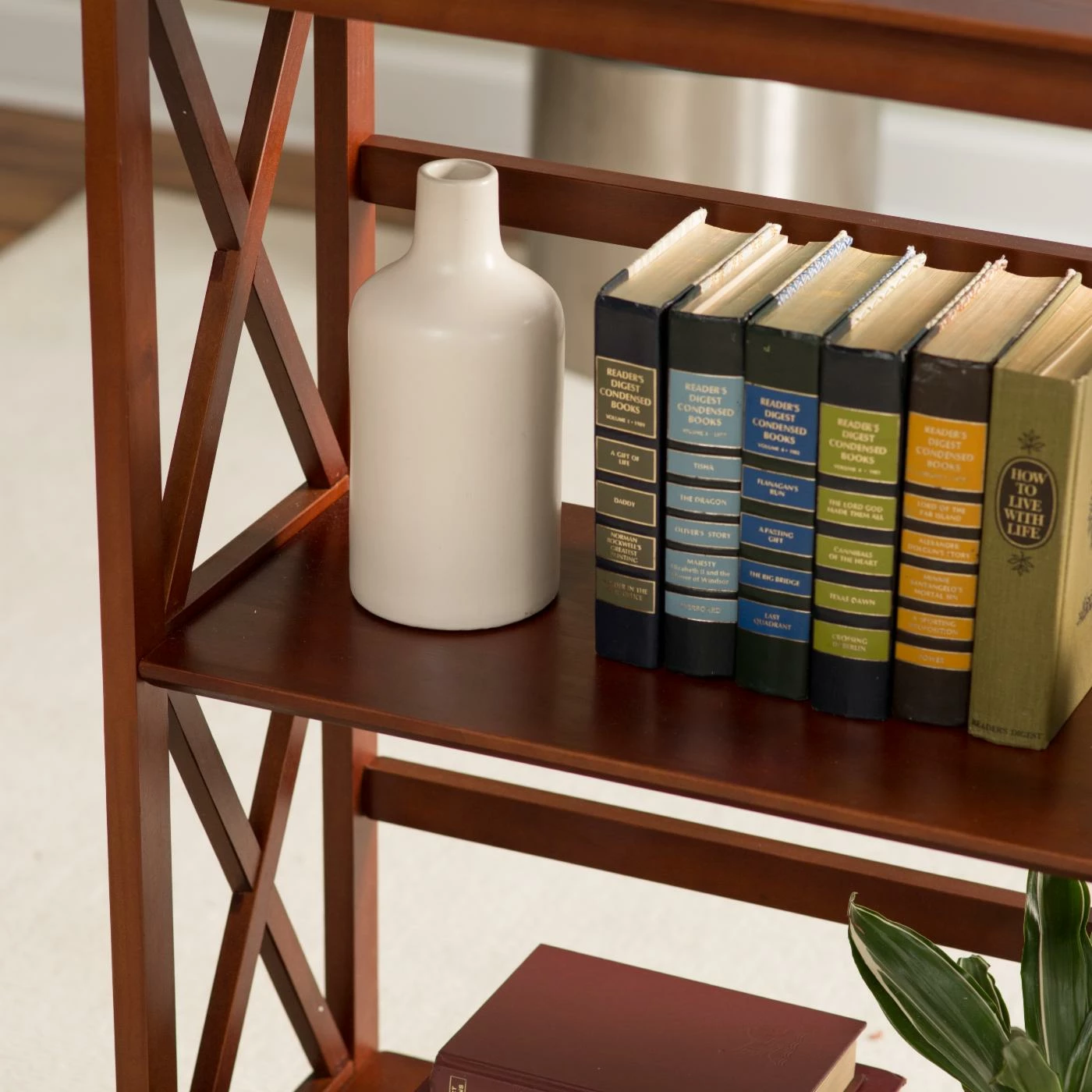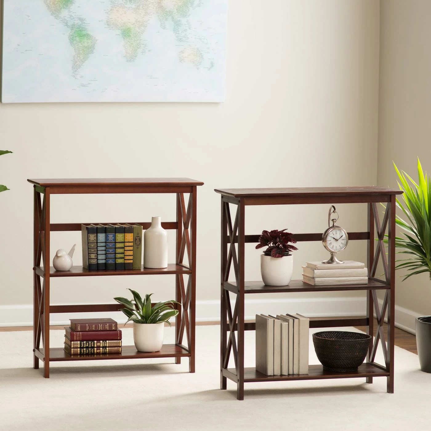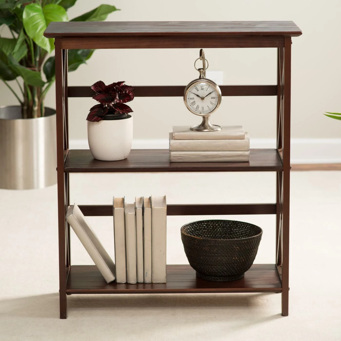 Please, pause and reflect for a moment on what the the MontegoΒ 3 Tier BookcaseΒ can do for you. It’s happy to carry your books, display art, ceramics, records, plants, or whatever you’re into on its three spacious shelves. This bookcase is made of solid wood and finished in rich color of your choiceΒ that coordinates with any decor. Cross-braced sides offer an appealing visual complement that works in both contemporary and traditional spaces.