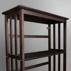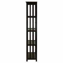 Our sytlists often recommend mission-style pieces to create harmony between contemporary and traditional elements. The Mission Style 5-Tier Wood Bookcase offers solid wood construction and blends well in such a wide variety of settings, from bath to home office to living areas. Its beautiful mission design features long, sleek slatted sides and an open back for an airy look and feel. Constructed of solid pine, this bookshelf has a rich espresso lacquered finish. Four shelves offer plenty of storage for books, DVDs, CDs, and more. This sturdy, durable bookshelf is an ideal addition to any room in your home. Assembly required.